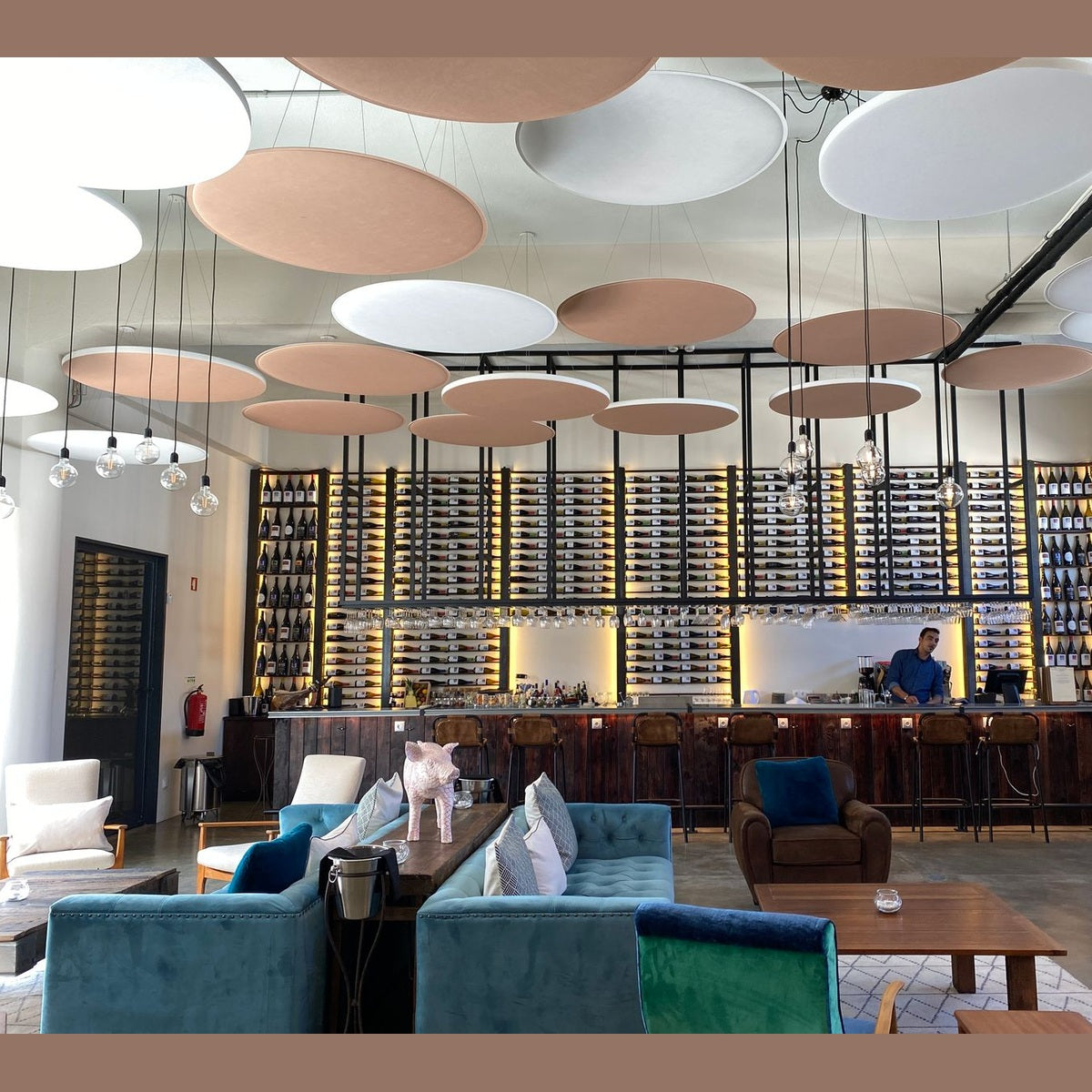 Being a suspended acoustic element, it presents twice the area of absorption material than a common acoustic panel, making it a very effective solution for high ceilings venues. The minimum installation height of the clouds is 500mm and the maximum is 1180mm from the ceiling.